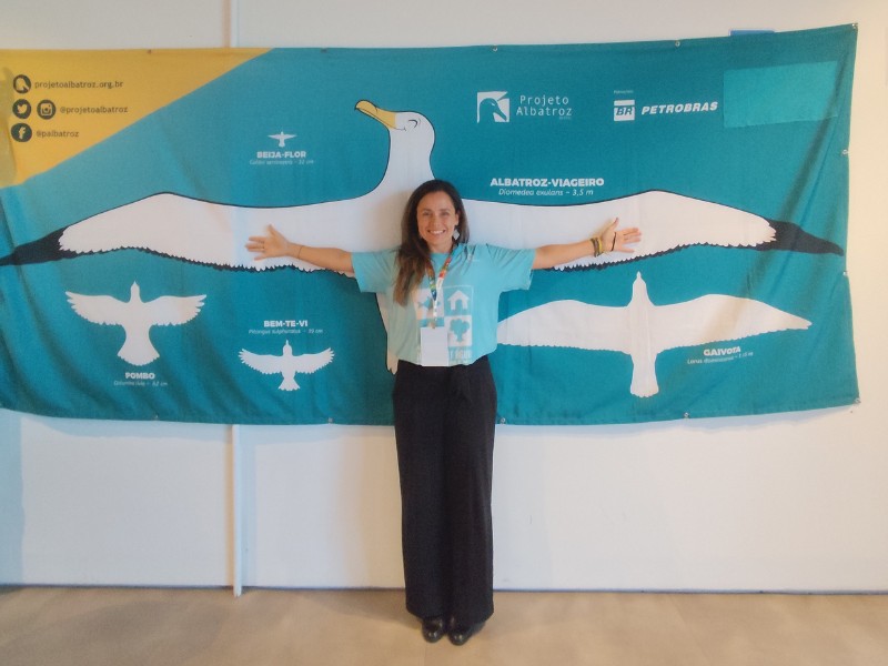 Em cada material exposto pelo projeto, havia uma oportunidade de mergulhar na temática oceânica e aprender mais sobre as aves marinhas. Um deles, um globo terrestre que mostra as rotas de voo dos albatrozes ao redor do mundo, chamou atenção dos visitantes, assim como o painel de asas, que compara a envergadura do albatroz-viageiro (Diomedea exulans), que pode chegar a 3,5m, a outras aves conhecidas, como a gaivota (Larus dominicanus) e o bem-te-vi (Pitangus sulphuratus).