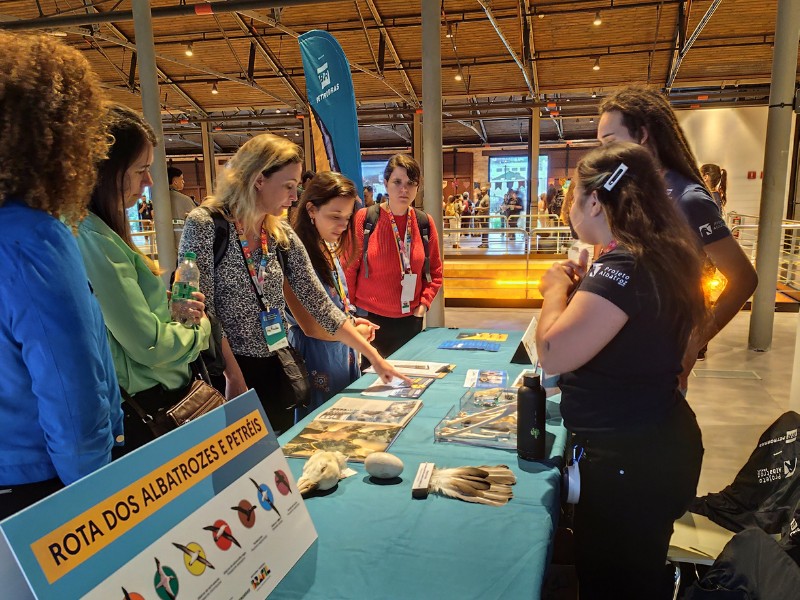 Materiais biológicos, como penas, ossos, crânios e até mesmo uma réplica de ovo de albatroz em tamanho real encantaram o público e geraram curiosidade, abrindo espaço para trocas de conhecimento sobre essas aves, que passam a maior parte da vida em alto-mar.