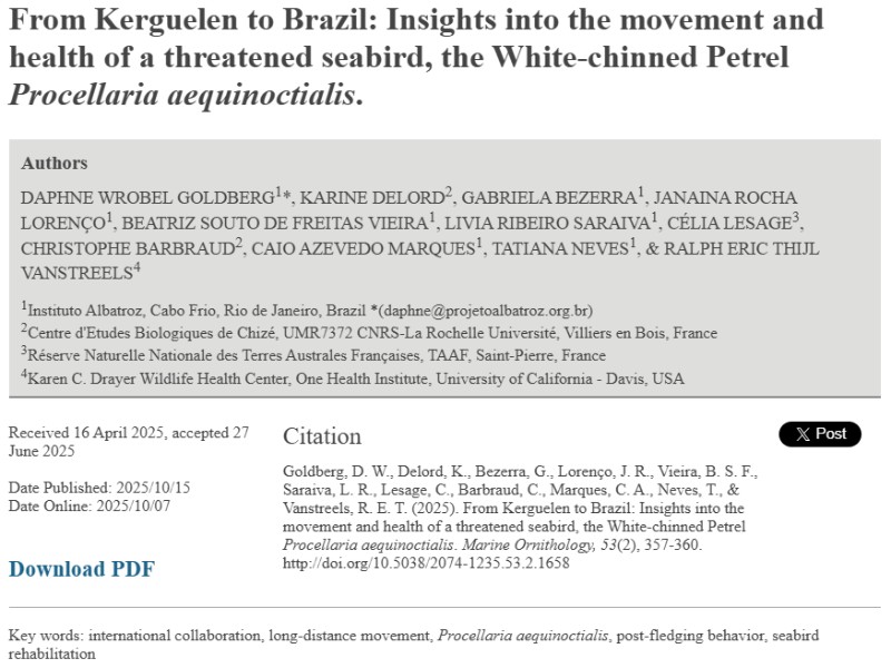 A equipe de médicos-veterinários e biólogos do Instituto Albatroz, que executa o Projeto de Monitoramento de Praias (PMP-BC/ES) em parte da Região dos Lagos (RJ), comemora a publicação do artigo científico “De Kerguelen ao Brasil: Insights sobre a migração e a saúde de uma pardela-preta (Procellaria aequinoctialis)” na revista Marine Ornithology (http://www.marineornithology.org/article?rn=1658). O estudo apresenta o caso de uma Pardela-preta que foi anilhada ainda filhote, em abril de 2023, nas Ilhas Kerguelen, no sul do Oceano Índico, e resgatada na Praia Grande, em Arraial do Cabo, em julho de 2024, pela equipe de campo do Instituto Albatroz. A realização do PMP-BC/ES é uma exigência do licenciamento ambiental federal, conduzido pelo Ibama.